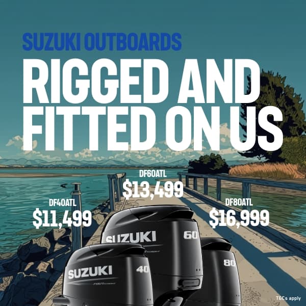 Terms & Conditions: This offer is available on new Suzuki DF40ATL, DF60ATL, and DF80ATL models purchased between 01/04/26 and 31/06/26 at participating Suzuki dealers while stocks last. Advertised savings are off the Fully Fitted price. Price includes control cables, tachometer (DF40/60), 25L fuel tank, propeller, boat fitting, side-mount control, and black analogue gauge (DF40/60) or multi-function gauge (DF80). Exclusions: Removal of previous outboard motor and controls, repairs to electrical systems, fuel system/dash repairs, and transom repairs. Demo units and all other promotions.
